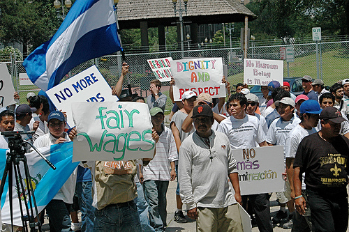Starting from Armstrong Park members of the Congress of Day Laborers, an organized group of Latino day laborers, led the crowd. They were followed by The Hot Eight, a local brass band.